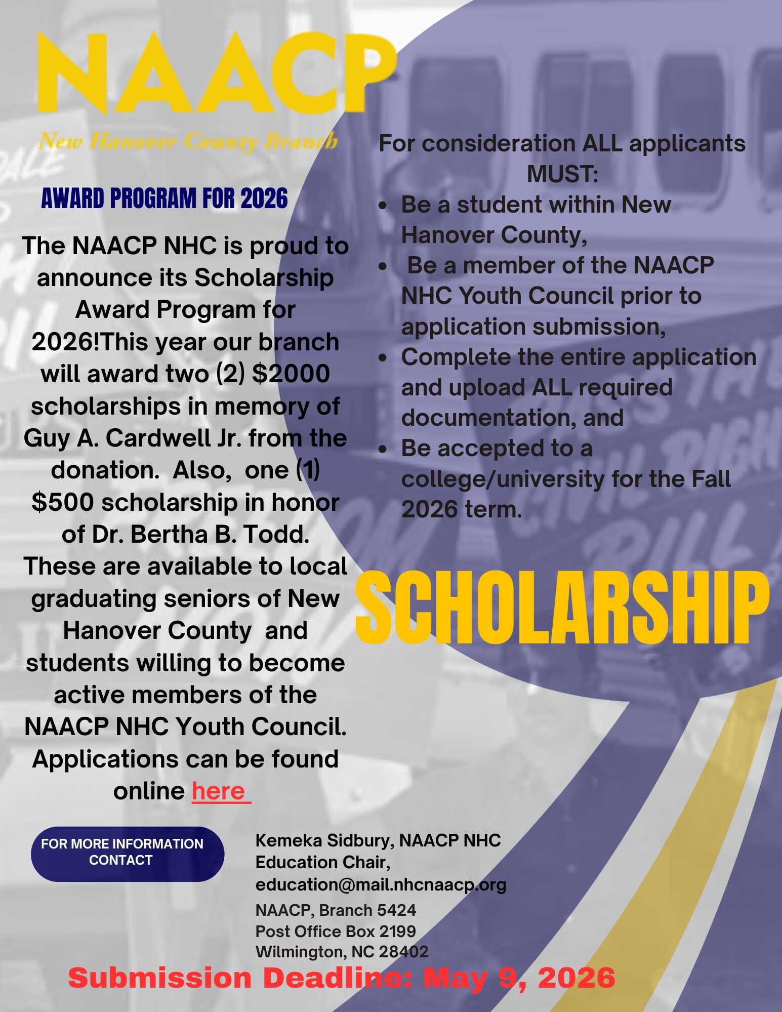 New Hanover County Branch of the NAACP Scholarship Personal InformationFirst Name *Last Name *Email AddressPhone *Street AddressApartment, suite, etcCityState/ProvinceZIP / Postal CodeCountryAfghanistanAlbaniaAlgeriaAmerican SamoaAndorraAngolaAnguillaAntarcticaAntigua and BarbudaArgentinaArmeniaArubaAustraliaAustriaAzerbaijanBahamasBahrainBangladeshBarbadosBelarusBelgiumBelizeBeninBermudaBhutanBoliviaBosnia and HerzegovinaBotswanaBouvet IslandBrazilBritish Indian Ocean TerritoryBruneiBulgariaBurkina FasoBurundiCabo VerdeCambodiaCameroonCanadaCayman IslandsCentral African RepublicChadChileChina, People's Republic ofChristmas IslandCocos IslandsColombiaComorosCongo, Democratic Republic of theCongo, Republic of theCook IslandsCosta RicaCroatiaCubaCuraçaoCyprusCzech RepublicCôte d'IvoireDenmarkDjiboutiDominicaDominican RepublicEast TimorEcuadorEgyptEl SalvadorEquatorial GuineaEritreaEstoniaEthiopiaFalkland IslandsFaroe IslandsFijiFinlandFranceFrance, MetropolitanFrench GuianaFrench PolynesiaFrench South TerritoriesGabonGambiaGeorgiaGermanyGhanaGibraltarGreeceGreenlandGrenadaGuadeloupeGuamGuatemalaGuernseyGuineaGuinea-BissauGuyanaHaitiHeard Island And Mcdonald IslandHondurasHong KongHungaryIcelandIndiaIndonesiaIranIraqIrelandIsraelItalyJamaicaJapanJerseyJohnston IslandJordanKazakhstanKenyaKiribatiKorea, Democratic People's Republic ofKorea, Republic ofKosovoKuwaitKyrgyzstanLao People's Democratic RepublicLatviaLebanonLesothoLiberiaLibyaLiechtensteinLithuaniaLuxembourgMacauMadagascarMalawiMalaysiaMaldivesMaliMaltaMarshall IslandsMartiniqueMauritaniaMauritiusMayotteMexicoMicronesiaMoldovaMonacoMongoliaMontenegroMontserratMoroccoMozambiqueMyanmarNamibiaNauruNepalNetherlandsNetherlands AntillesNew CaledoniaNew ZealandNicaraguaNigerNigeriaNiueNorfolk IslandNorth MacedoniaNorthern Mariana IslandsNorwayOmanPakistanPalauPalestine, State ofPanamaPapua New GuineaParaguayPeruPhilippinesPitcairn IslandsPolandPortugalPuerto RicoQatarReunion IslandRomaniaRussiaRwandaSaint HelenaSaint Kitts and NevisSaint LuciaSaint Pierre & MiquelonSaint Vincent and the GrenadinesSamoaSan MarinoSao Tome and PrincipeSaudi ArabiaSenegalSerbiaSeychellesSierra LeoneSingaporeSint MaartenSlovakiaSloveniaSolomon IslandsSomaliaSouth AfricaSouth Georgia and South SandwichSpainSri LankaStateless PersonsSudanSudan, SouthSurinameSvalbard and Jan MayenSwazilandSwedenSwitzerlandSyriaTaiwan, Republic of ChinaTajikistanTanzaniaThailandTogoTokelauTongaTrinidad and TobagoTunisiaTurkeyTurkmenistanTurks And Caicos IslandsTuvaluUS Minor Outlying IslandsUgandaUkraineUnited Arab EmiratesUnited KingdomUnited States of America (USA)UruguayUzbekistanVanuatuVatican CityVenezuelaVietnamVirgin Islands, BritishVirgin Islands, U.S.Wallis And Futuna IslandsWestern SaharaYemenZambiaZimbabweDate of Birth *Parent Guardian Name *Parent Guardian Phone Number *EducationDescribe any service activities you have been involved in. How have these activities contributed to the community and to your personal growth? *Name of high school where currently enrolled: *Graduation Date *Cumulative GPAClass Rank *What academic or other honors have you received? *What college or university are you planning to attend in the Fall of 2025? *What is your intended major/course of study? *Please provide a brief statement (100-200 words) highlight your educational objectives and how this scholarship will help you reach your goals. *Please provide information relevant to establishing financial need. This should include the estimated cost of one year at your college or university, financial contributions from your family, your work and savings, and any other scholarship or financial award you have already received. *Upload Supporting Documentation *Two letters of recommendation are required: one from a teacher or guidance counselor and one from either a member of the NHC branch of the NAACP or a pastor or work/volunteer supervisor. The recommendations should speak to the character of the applicant. The applicant will provide a transcript from the high school or college they are currently attending. (A photocopy of official transcripts is acceptable). Upload these supporting documents below or email them to nhcnaacp@gmail.comChoose FileNo file chosenDelete uploaded fileApply